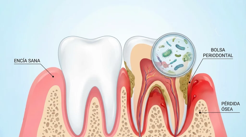 La periodontitis es una enfermedad inflamatoria crónica que afecta a los tejidos que sostienen los dientes: encía, ligamento periodontal, cemento radicular y hueso alveolar. Comienza casi siempre como una gingivitis, pero cuando la inflamación avanza hacia capas profundas, la destrucción del tejido de soporte es irreversible sin tratamiento.